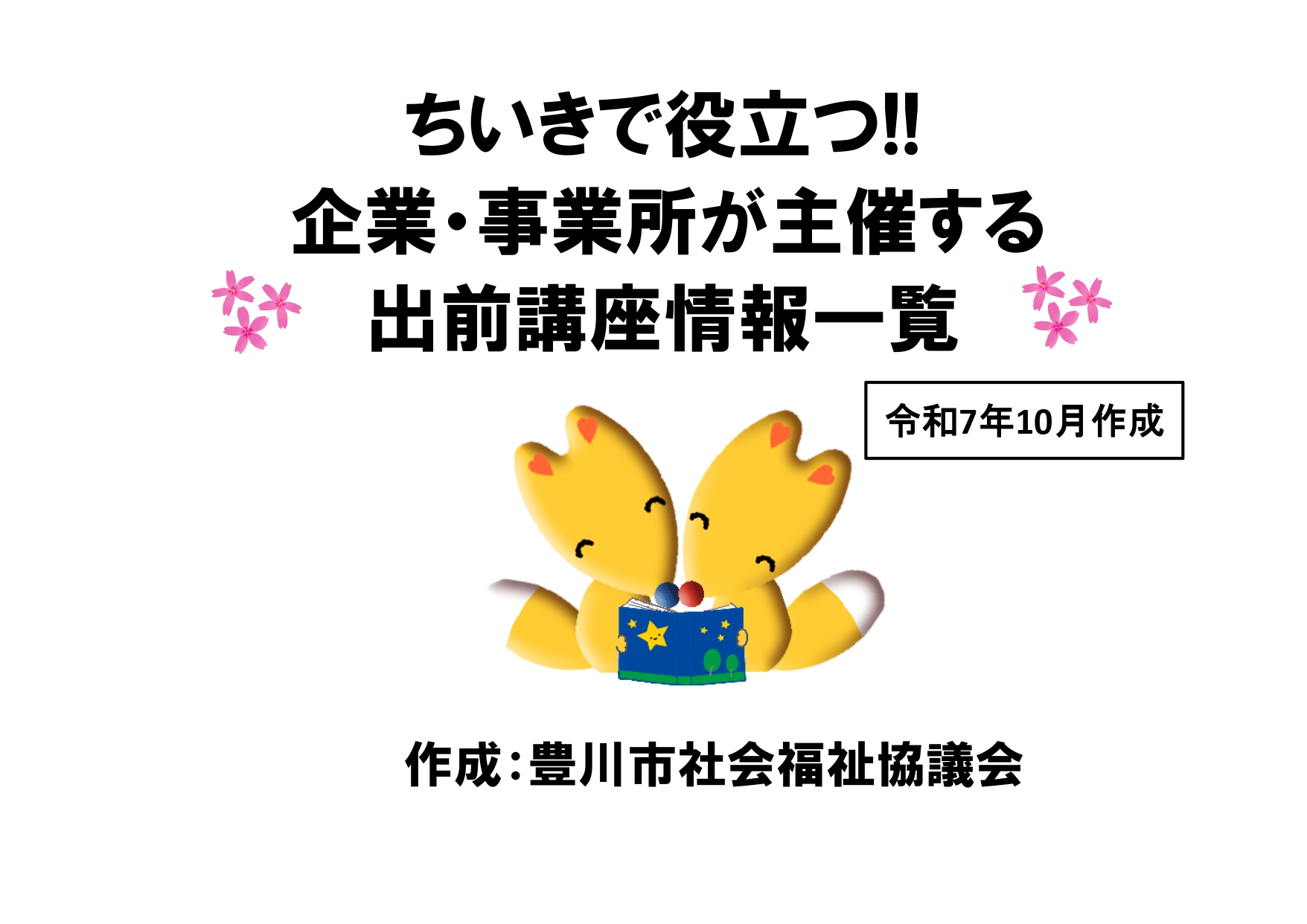 企業等が地域貢献の一環として行っている出前講座の情報の一覧を作成しました。 地域のふれあいサロン活動や老人クラブ、地域福祉活動推進委員会の勉強会等に是非ともご活用ください!