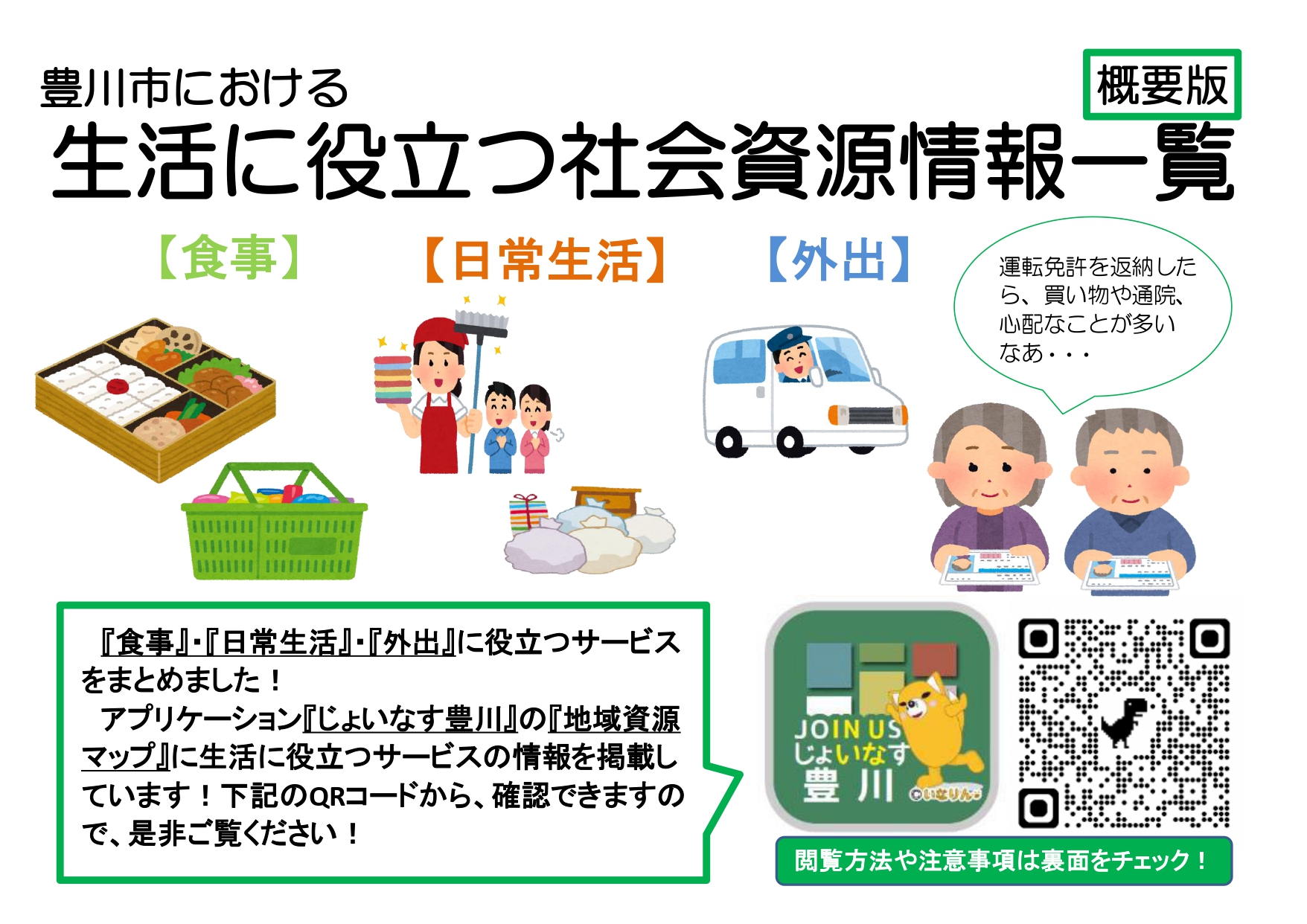 住み慣れた豊川市で元気にいきいきと生活できるよう「食事」・「日常生活」・「外出」に役立つサービスを生活支援コーディネーターがまとめましたので是非ご活用ください!