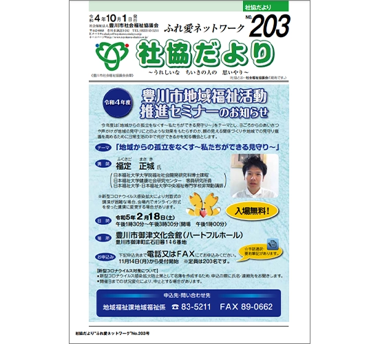 社協だよりは、豊川市社会福祉協議会の機関紙・福祉の広報誌です。年4回、各号2万4千部発行され、福祉に関する情報を皆様のもとへお届けしています。