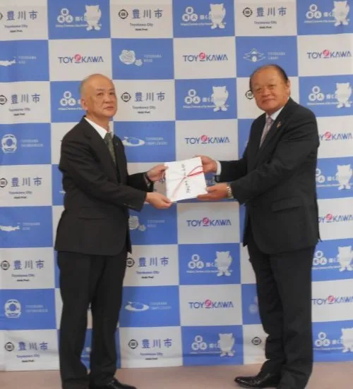 宗教法人世界心道教様から寄附をいただきました。(2025年12月) 令和7年12月18日(木)に豊川市役所において、宗教法人世界心道教様からご寄附をいただきました。 社会福祉事業等に活用させていただきます。ありがとうございました。 (社会福祉協議会50万円、愛知県共同募金会豊川市共同募金委員会50万円)
