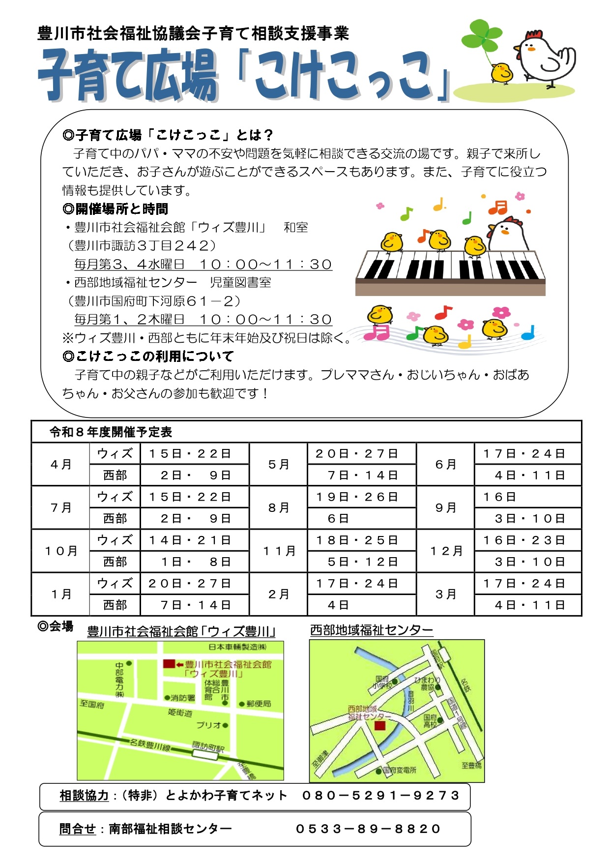 豊川市社会福祉協議会では、子育て中のパパママの不安や問題を気軽に相談できる交流の場である、子育て広場「こけこっこ」をNPO法人とよかわ子育てネットのご協力のもと、開催しています。