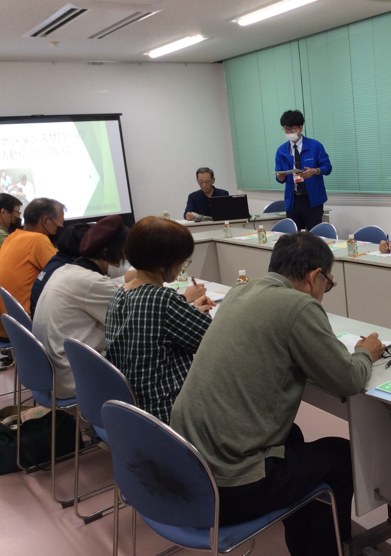 今回の意見交換テーマは「ふれあいサロン活動の活性化について」でした。意見交換の前にテーマに沿った情報提供として、男性の居場所づくりという観点で、三上地区で男性が中心となって活動する「メンズサロン」の代表の方から、メンズサロンの活動が始まった経緯や現在の活動状況等の説明、そして実際の活動の様子を収めた動画を用いながら活動紹介をしていただきました。