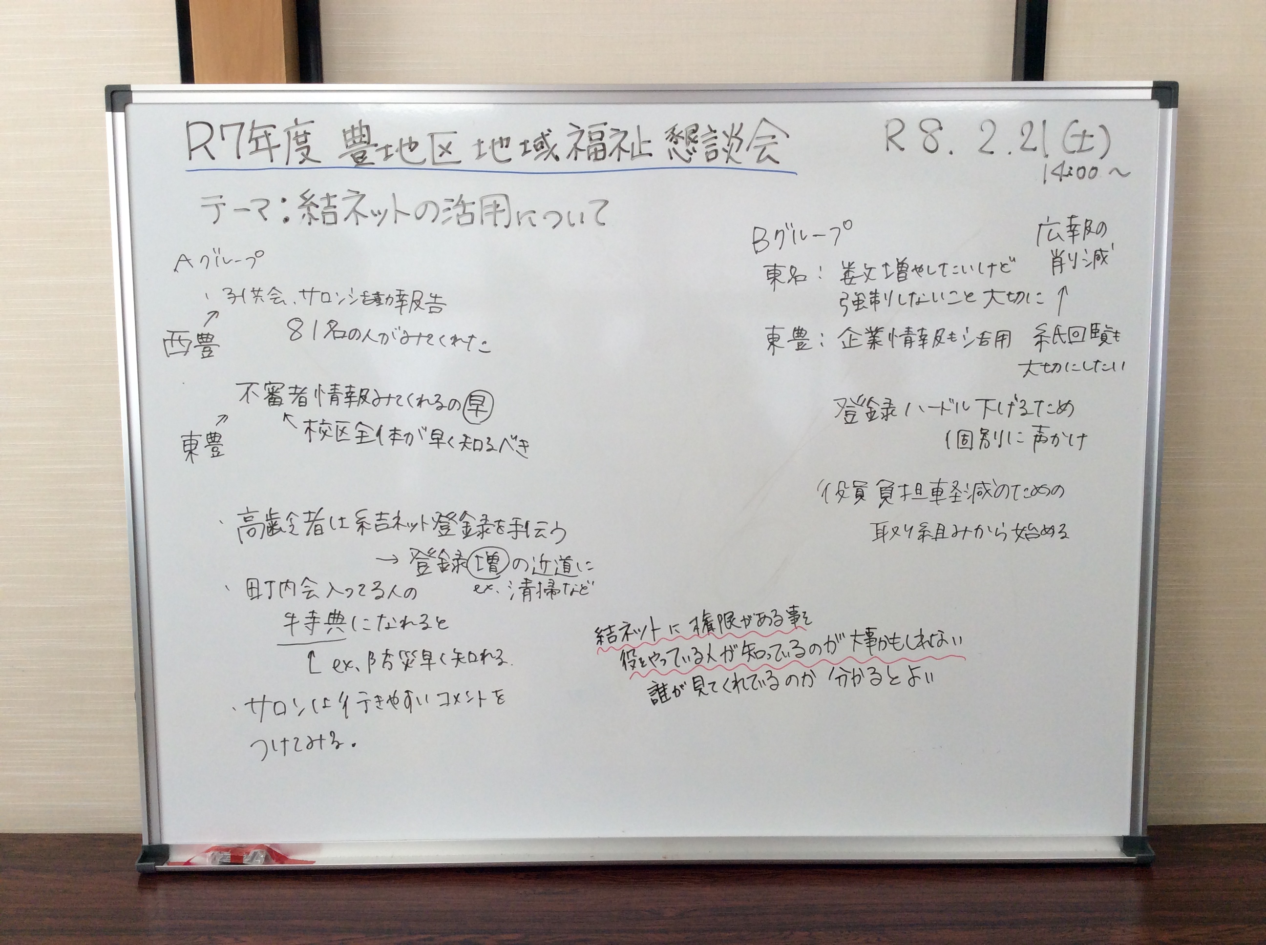 2月21日(土)に豊地区市民館にて、連区長、町内会長、福祉委員等の方々にお集まりいただき、地域の活動状況や地域での困りごとを解決するための話し合いを行う地域福祉懇談会を開催しました!